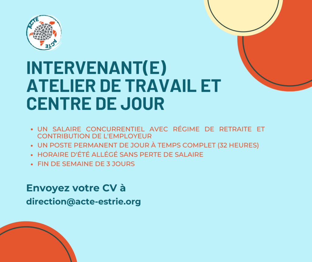 Fais parvenir ton CV par courriel à :Denis Gagnon, directeur général : direction@acte-estrie.org