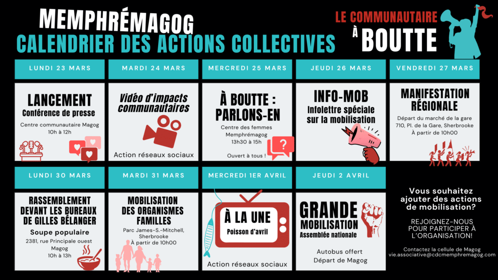 Aujourd’hui, c’est toute la Province du Québec qui est en effervescence avec le lancement d’un mouvement national de grèves et de revendications dans le milieu communautaire. En effet, dès à présent et jusqu’au 2 avril prochain, c’est tout le milieu communautaire qui se mobilise au travers de différentes actions, mais dans un seul but commun: faire réagir le gouvernement.