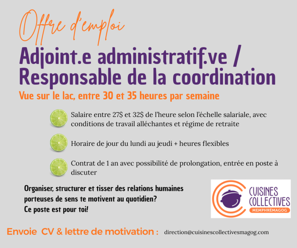 Pour postuler: Veuillez faire parvenir votre CV et une lettre de motivation à direction@cuisinescollectivesmagog.comDate limite : 19 avril 2026, les candidatures seront évaluées à partir du 15 avril 2026.